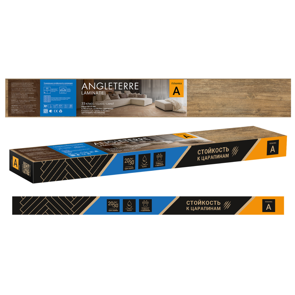 В коллекции ANGLETERRE планки двух видов: А и B (различие в расположении замка). Для укладки дизайна вам необходимо приобрести обе планки: А и B. Небольшой размер планки и специально разработанная конструкция замка позволяют легко и быстро уложить ламинат. Все дизайны в этой коллекции отличаются глубоким тиснением в регистре, что придаёт им аутентичный вид и текстуру настоящего дерева. В коллекции применяется новая 4-сторонняя крашенная MINI фаска. Она элегантно разделяет планки, гармонично усиливая эффект ручной обработки. Ламинат ANGLETERRE 33 класса износостойкости обеспечивает защиту от царапин, ударов и других повреждений.